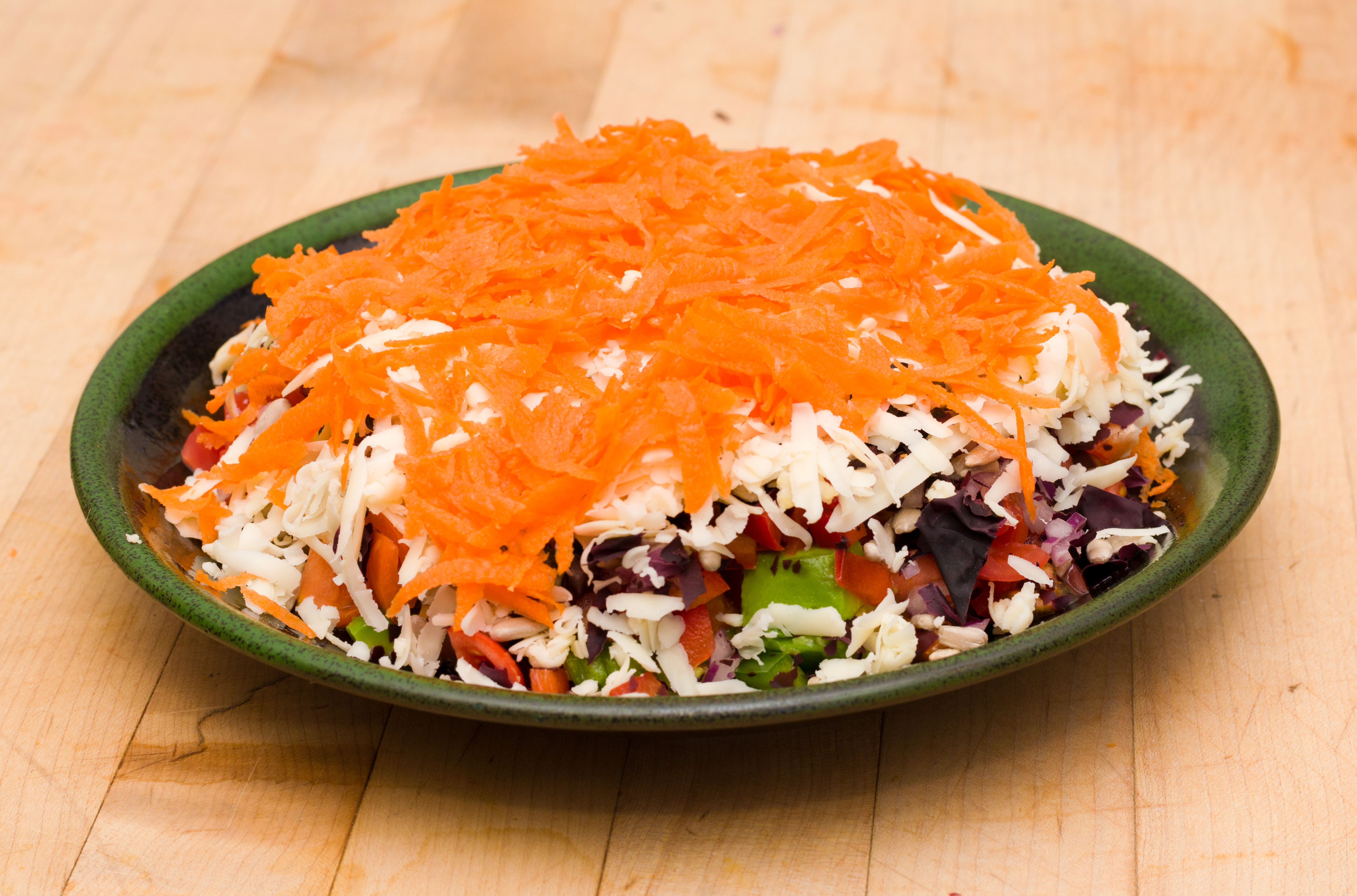 Cut each vegetable in a consistent size as noted above. Layer vegetables in the order given on a small plate or shallow bowl. Add salt to veggies before sunflower seeds. Drizzle oil and vinegar over salad just before serving.